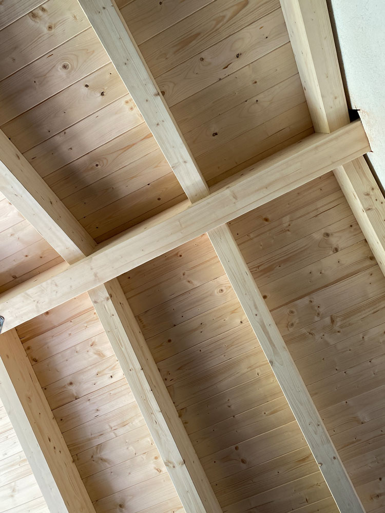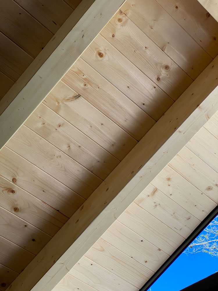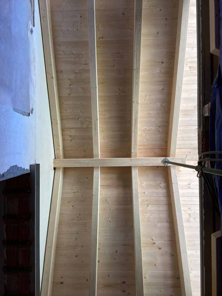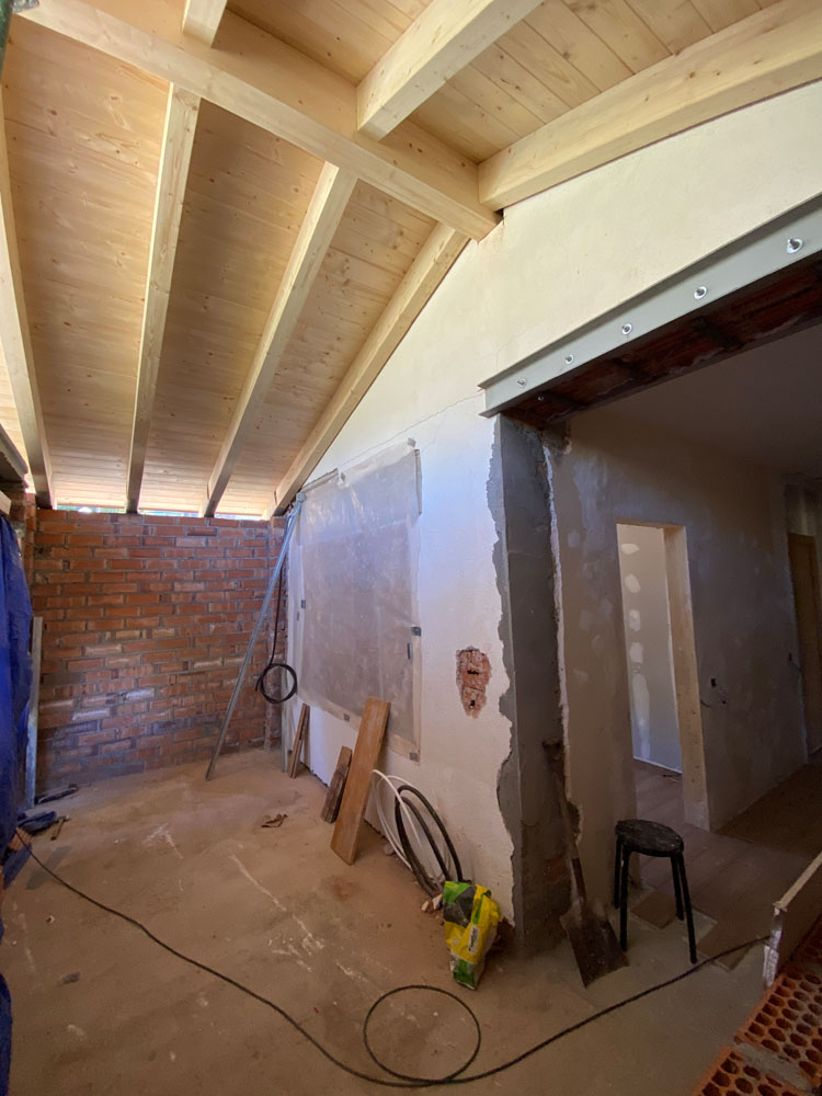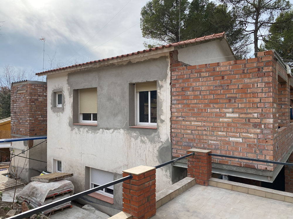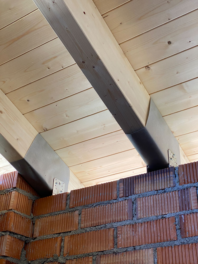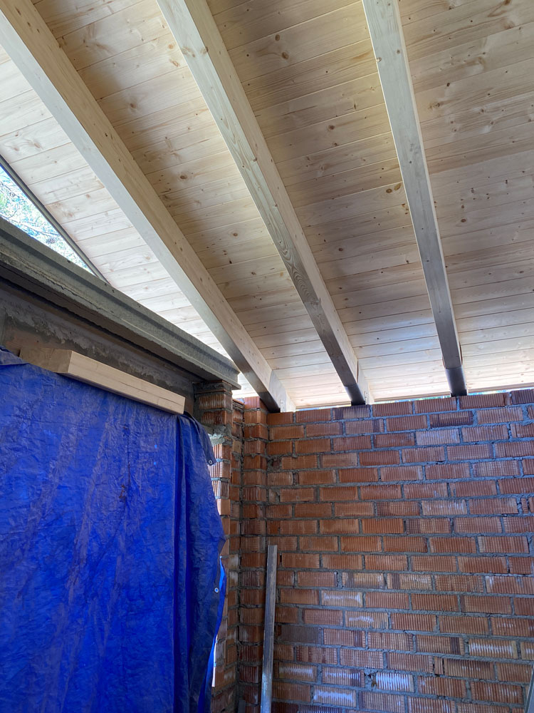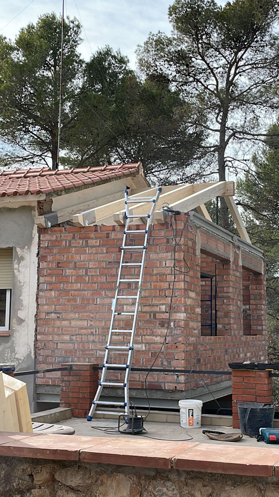 Ampliación de una casa antigua en Matadepera de 20m² con una cubierta ligera de madera. Está hecha con vigas de madera laminada GL24, machihembrado de pino natural, aislamiento térmico XPS, colocación de lámina impermeable y transpirable, rastreles de madera para la sujeción de las tejas y subministro y colocación de tejas. Los remates permietrales exteriores se hicieron con chapa galvanizada negra, de manera que proteje todas las capas interiores y deja un acabo resistente y elegante.